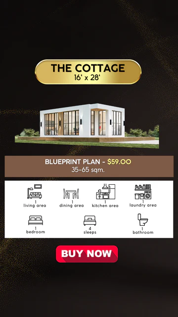 This is a modern, minimalist Cottage featuring a clean rectangular design with large floor-to-ceiling glass windows, allowing for abundant natural light. The structure has a combination of white walls and wooden accents, creating a warm, contemporary aesthetic. Exterior wall lights add functionality and style to the design. The raised wooden platform surrounding the house enhances its elegant appeal and provides a seamless connection to the outdoors, perfect for relaxation or entertaining